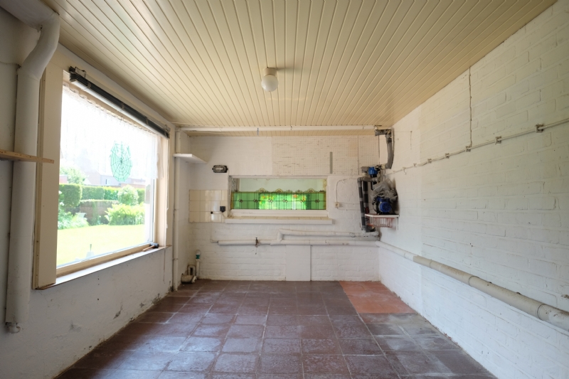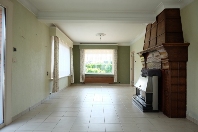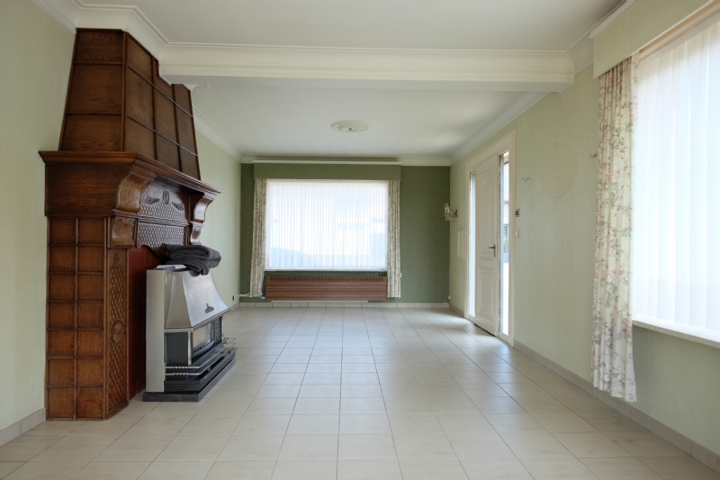 U komt de woning binnen aan de zijkant in de living. In de living bevindt zich een in hout beklede schouw met een gaskachel, de woning beschikt tevens over centrale verwarming. Vanuit de living heeft u mooi zicht over de zongerichte tuin. U komt door de living in de keuken terecht die tevens aan de achterzijde van de woning is en vanwaar u ook mooi zicht heeft over de tuin. De keuken zelf is uitgerust met een gaskookplaat, dampkap, oven, frigo en een dubbele spoeltafel. Bij de keuken bevindt zich ook de trap naar het verdiep en onder de trap is er een berging voorzien. Naast de keuken, aan de voorzijde van de woning bevindt er zich nog een voorplaats. Deze kan verscheidene doeleinden hebben, deze kan gebruikt worden als eetplaats, bureau of slaapkamer. Daar deze zich naast de living bevindt bestaat de mogelijkheid ook om de muur te openen en deze tot 1 grote ruimte om te vormen. Naast de keuken bevindt zich ook de ruime garage, deze is uitgerust met een geautomatiseerde, sectionale poort. In de garage bevinden zich ook de aansluitingen van gas en elektriciteit en ook de aansluiting voor de was- en droogautomaat. Achteraan de garage bevindt zich het 1ste toilet. Achter de garage bevinden zich nog 2 ruime bergingen die ook toegang hebben tot de tuin.