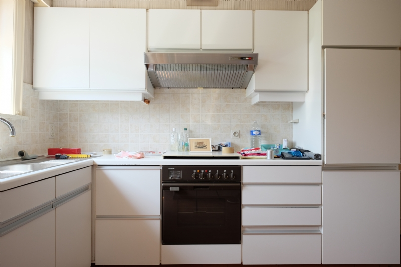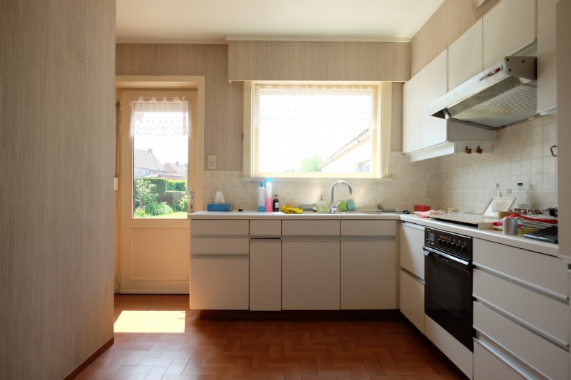 Keuken gesloten keuken met , kookplaat op gas, dampkap, frigo, warme luchtoven