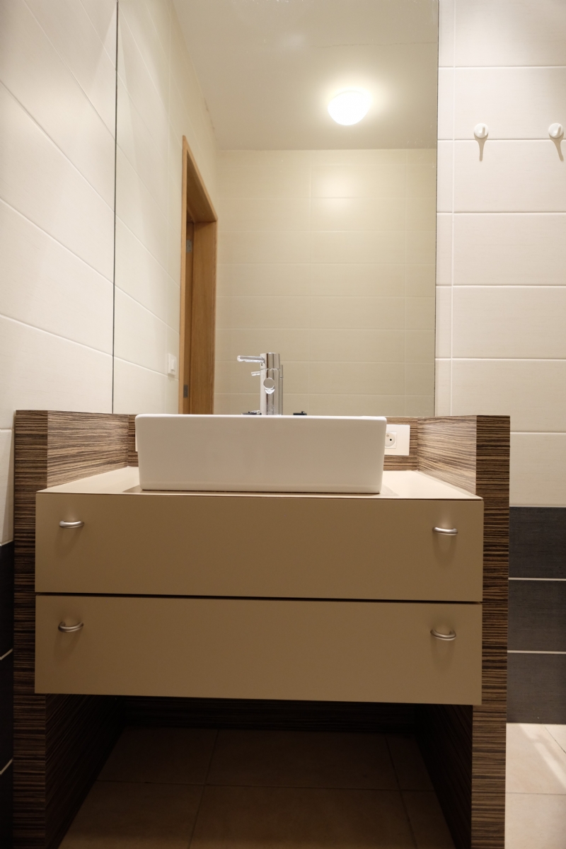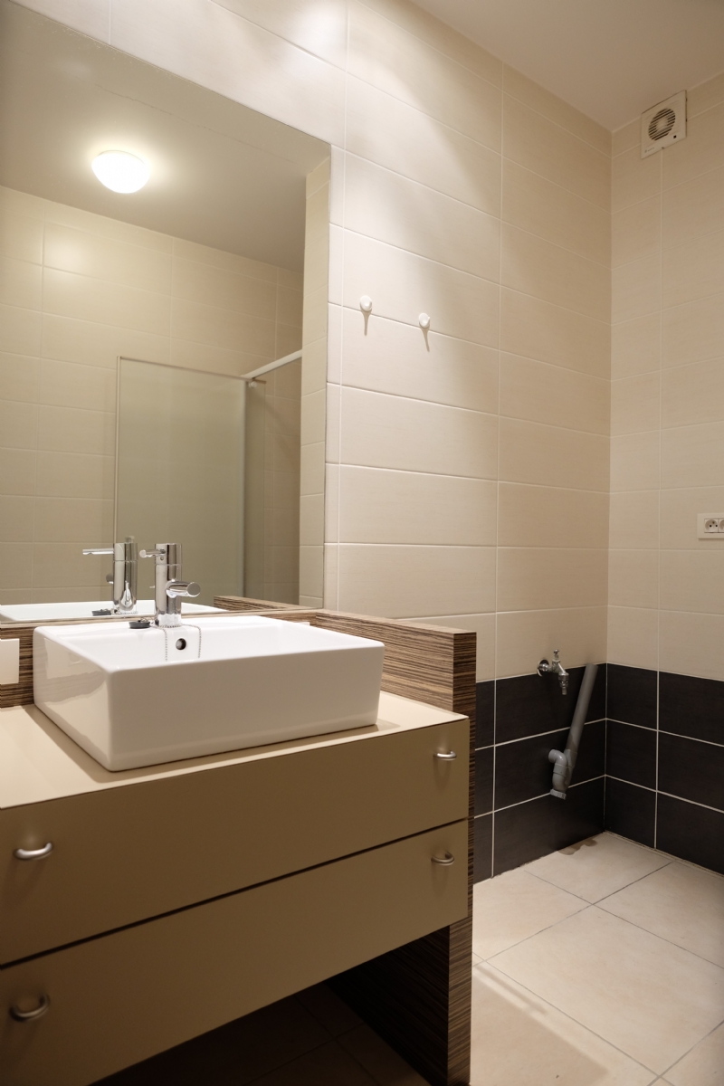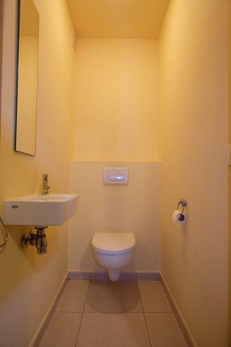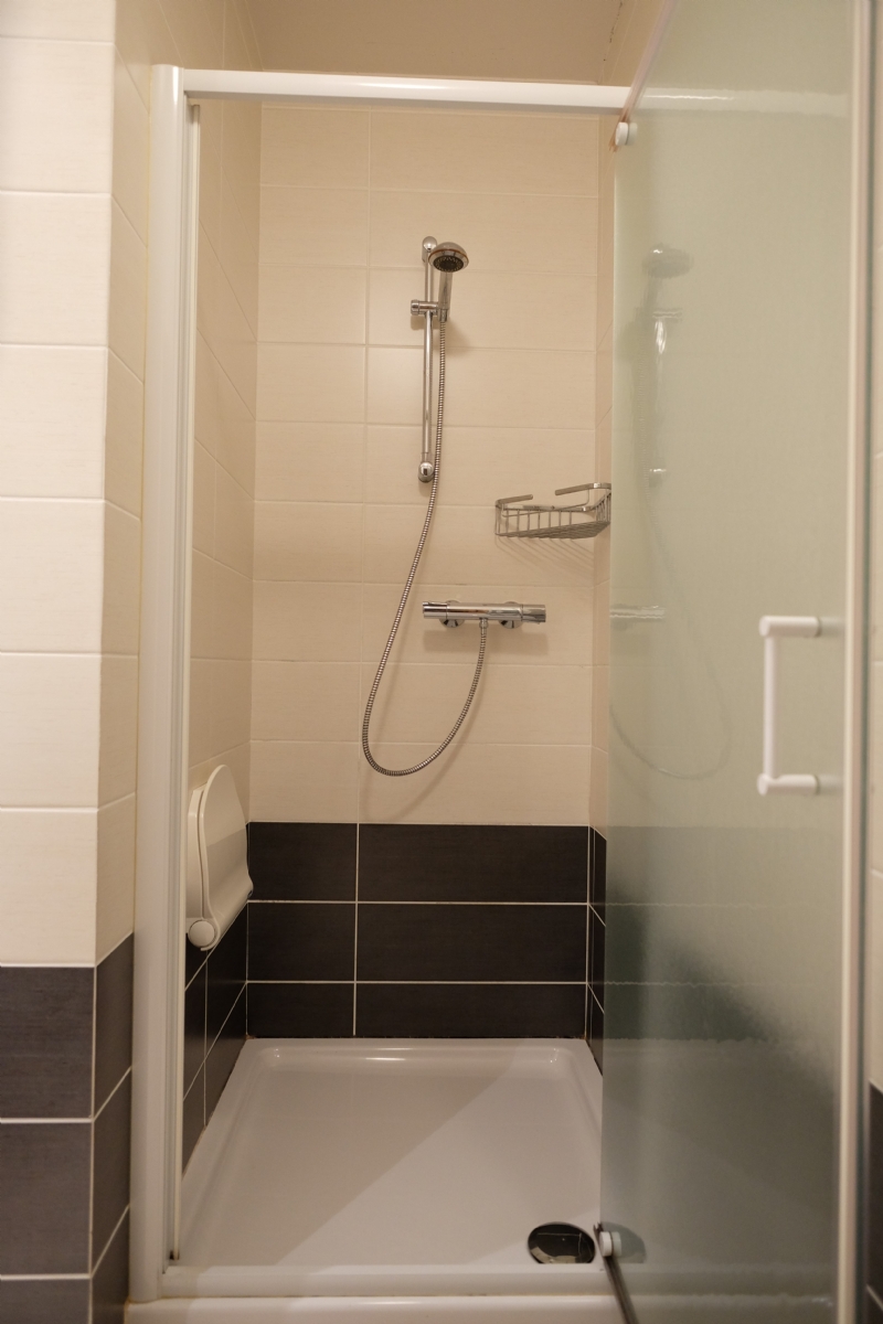 Naast de slaapkamers vindt u er ook nog de badkamer, deze is uitgerust een lavabomeubel met onderkasten en spiegel en een ruime douche met thermostatische kraan en ook nog een opklapbaar zitbankje voor mensen die niet meer zo mobiel zijn. Tenslotte is er ook de aansluiting voor de wasmachine en/of droogautomaat.