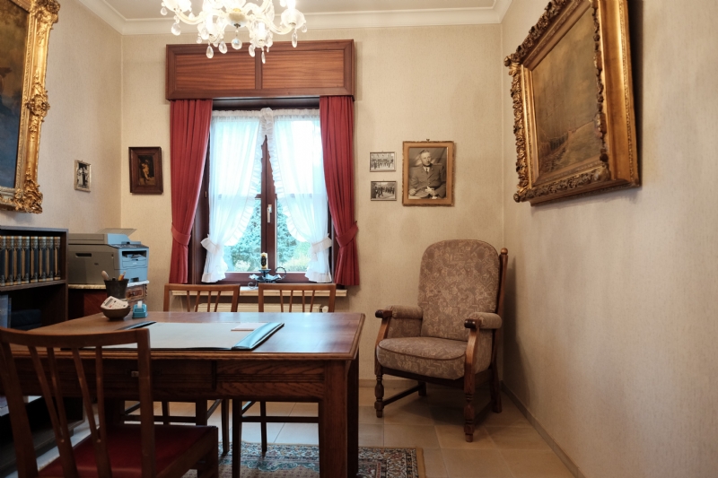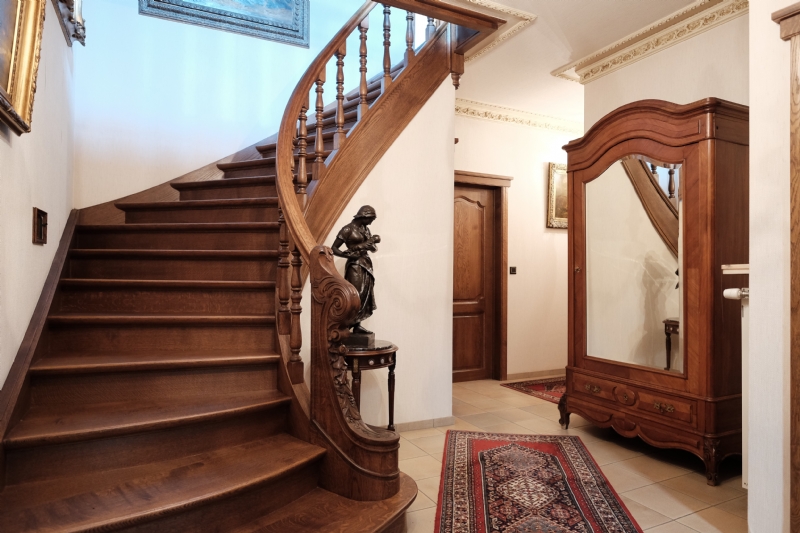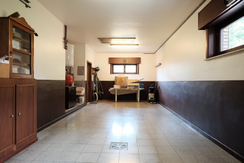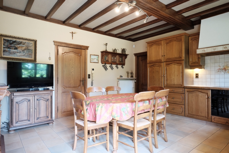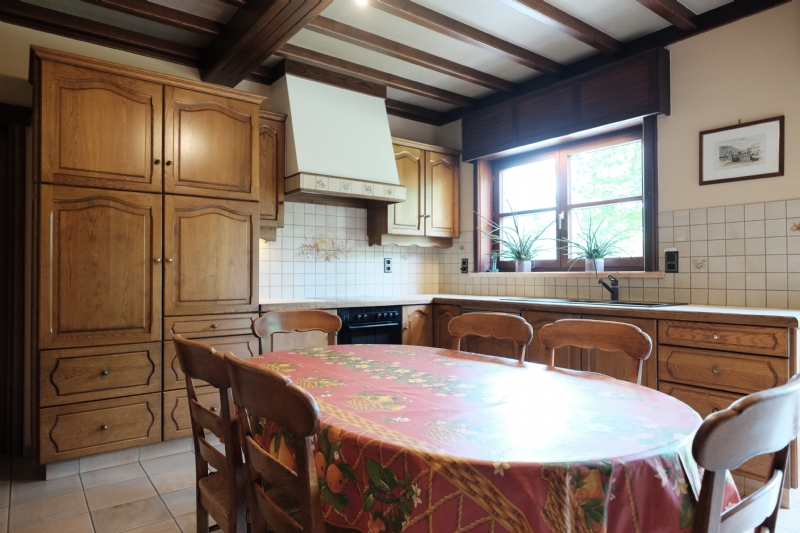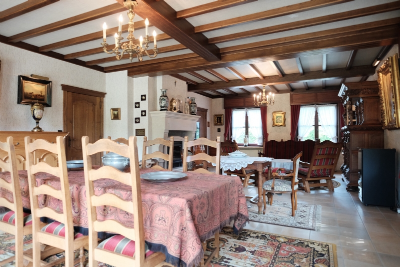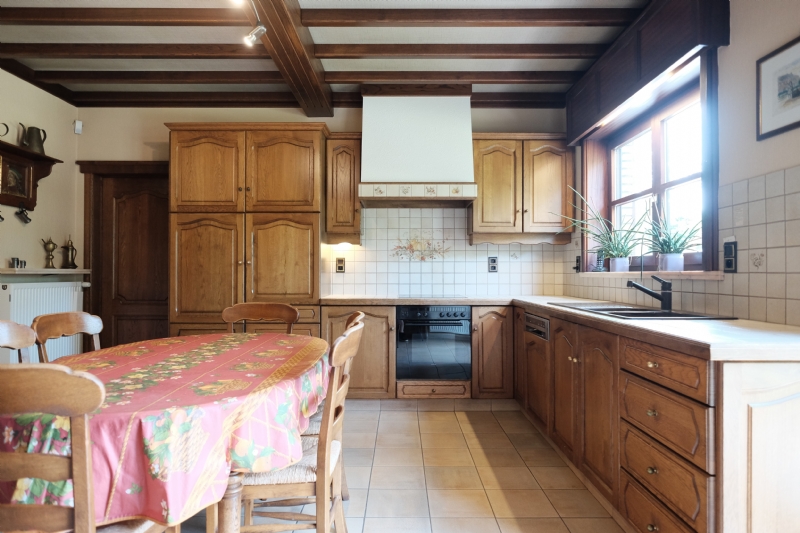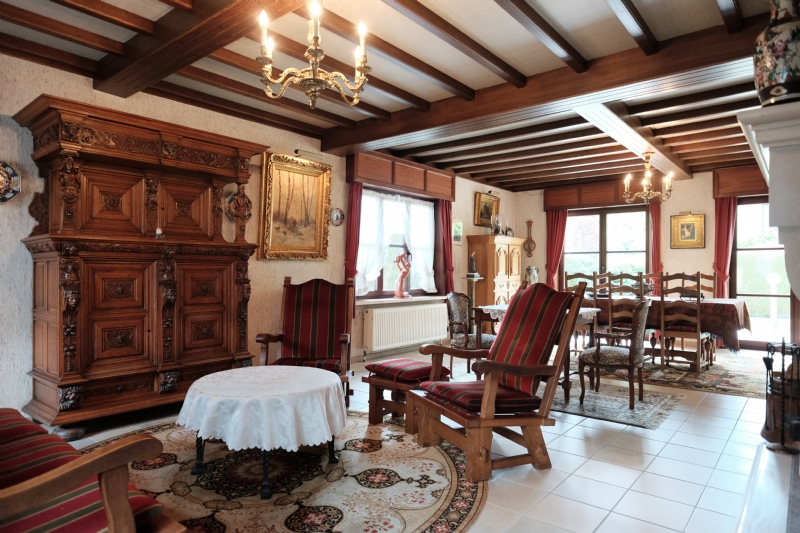 1. Gelijkvloers (10 meter x 20 meter) : inkom met massief eiken gesculpteerde trap ; betegeld toilet met lavabo ; living (ca. 50 m²) met eiken balken en natuurstenen schouw met inbouwcassette Flamm met warmeluchtcirculatie naar hall en living ; leefkeuken (ca. 25 m²) met eiken balken en kasten met vitrokeramische kookplaat, dampkap, oven, vaatwas, dubbele spoeltafel en spaarboiler ; ingerichte witte bijkeuken-wasplaats met kasten, microgolf en voorziening voor wasmachine, droogkast en diepvriezer ; garage voor 2 wagens met geautomatiseerde, afstandsbediende poort, uitgietbak en cv-installatie ; grote slaapkamer ; bureel of tweede kamer ; betegelde badkamer met wit meubilair (2 wastafels en onderkasten, kolomkasten en spiegelkast), ligbad (met thermostatische badmengkraan en handsproeier), douche (met thermostatische kraan met hoofdsproeier, 3 zijsproeiers en handsproeier), tweede toilet.