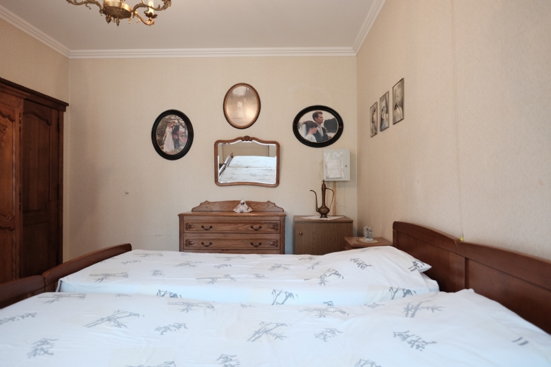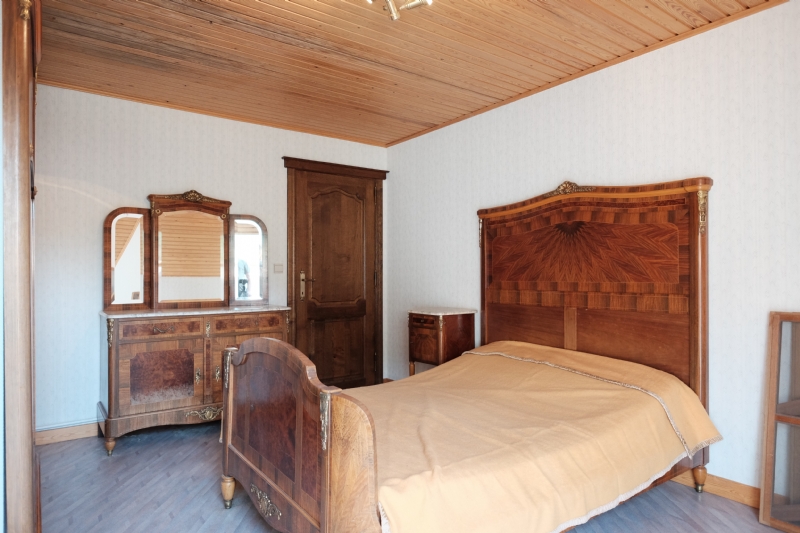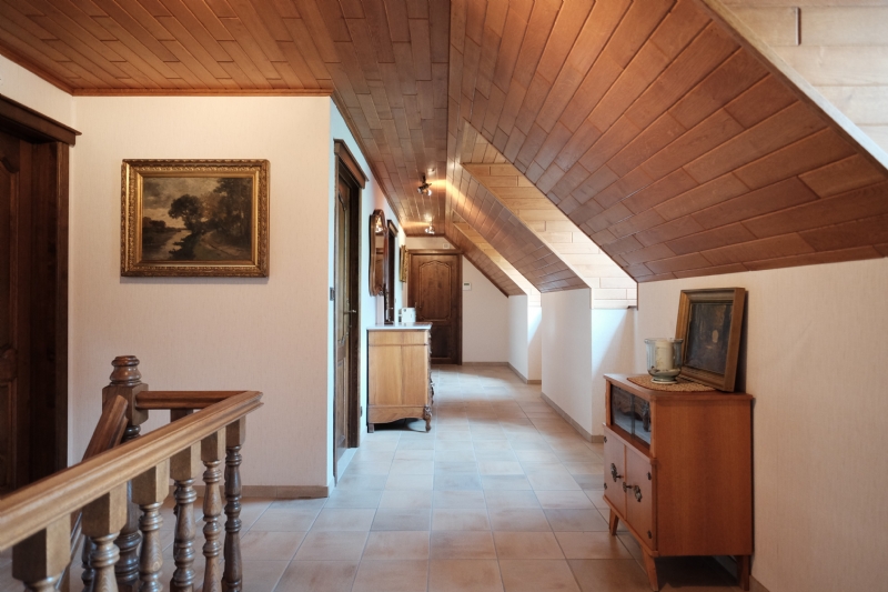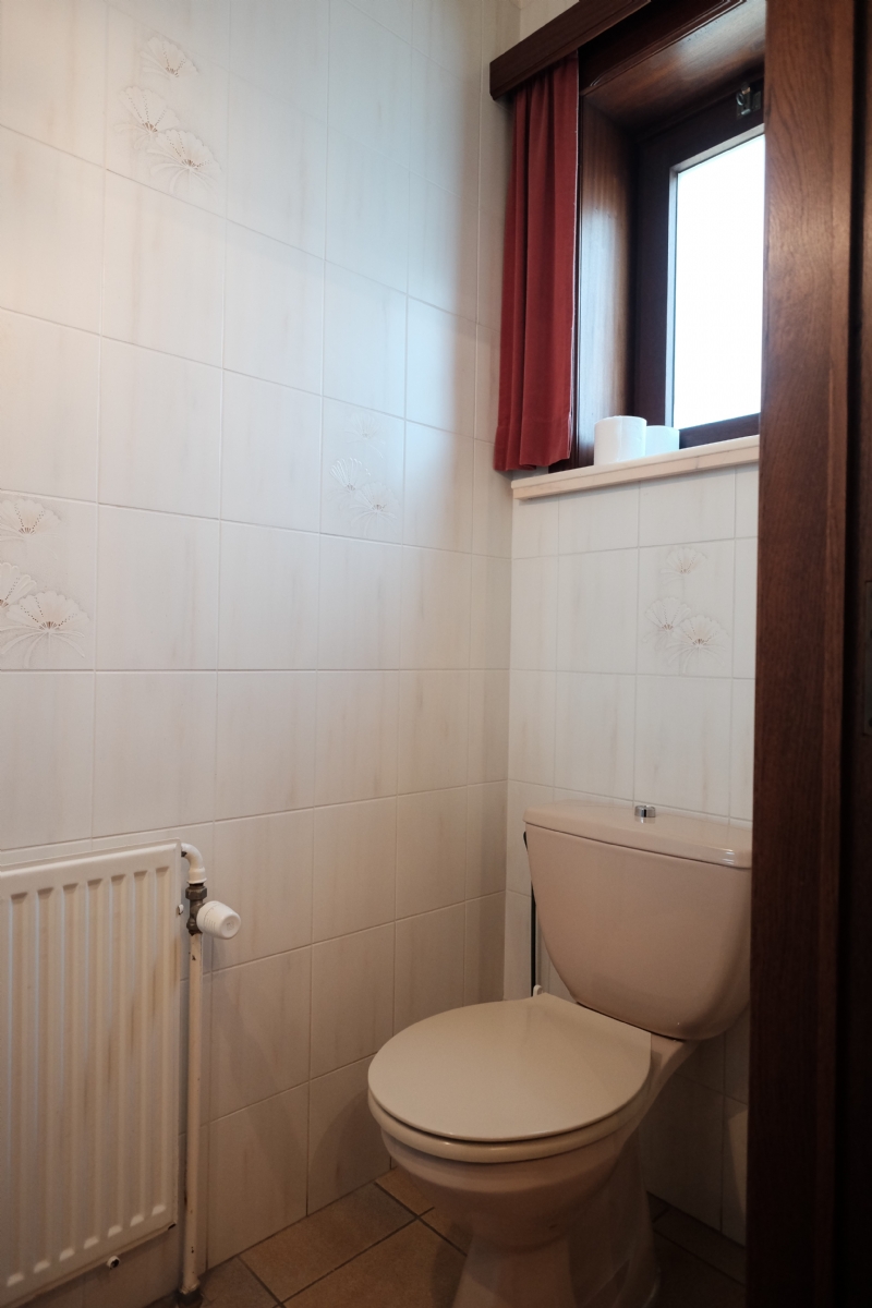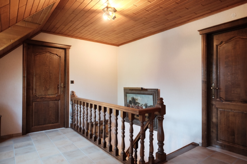 2. Verdieping : grote nachthall, drie zeer grote slaapkamers, een vierde grote onafgewerkte slaapkamer die tot op heden als berging werd gebruikt, betegelde badkamer met wit meubilair (2 wastafels en onderkasten, kolomkasten en spiegelkast), ligbad en derde toilet.