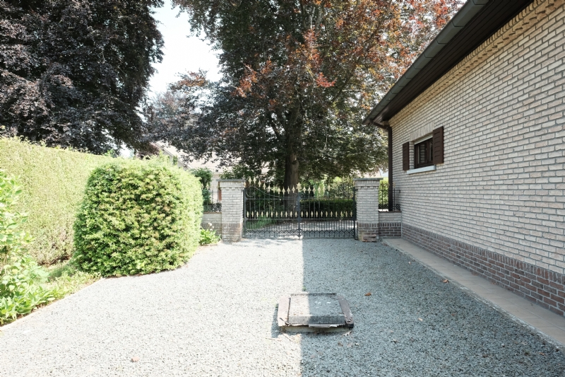 Afgesloten parking in grint rechts van de woning en voorzien van smeedijzeren poort en smeedijzeren afsluiting ;