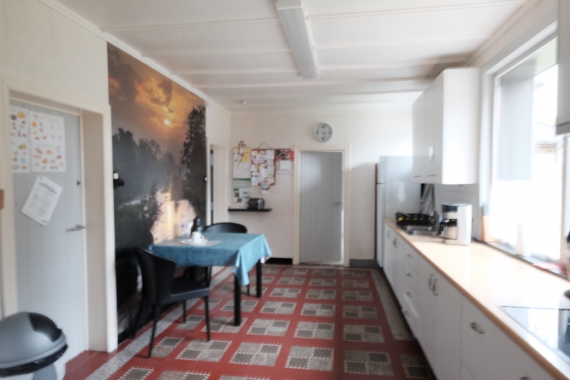inkomhal met trap, living, ingerichte keuken met afwasbekken, dampkap, karmische kookplaten, wasplaats, keukenberging