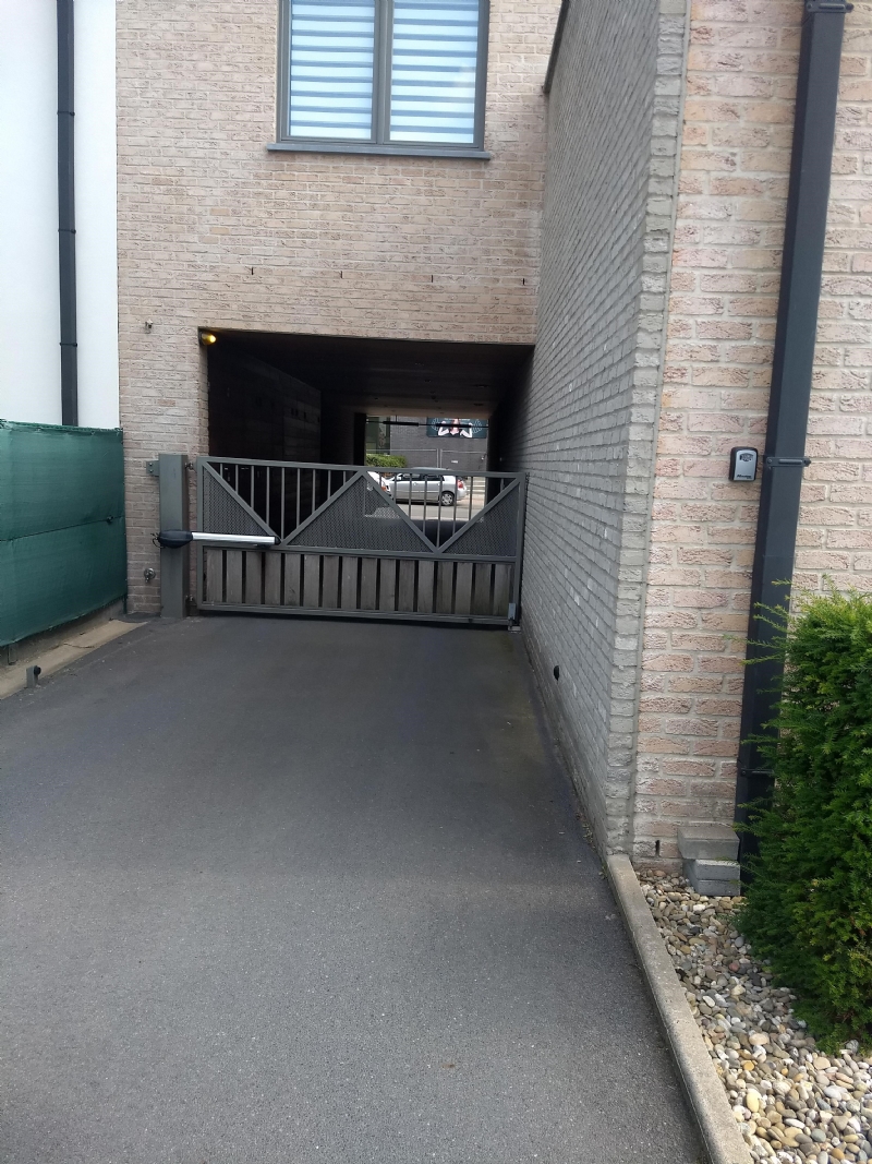 Garagekoer afgesloten met geautomatiseerde inrijpoort. Verlichting op koer aanwezig op basis van bewegingsmelders, rijruimte in asfalt