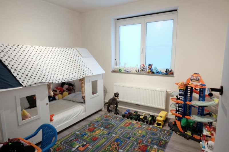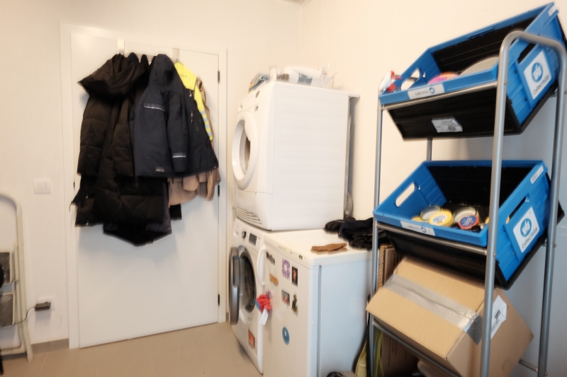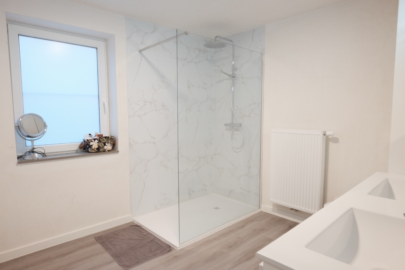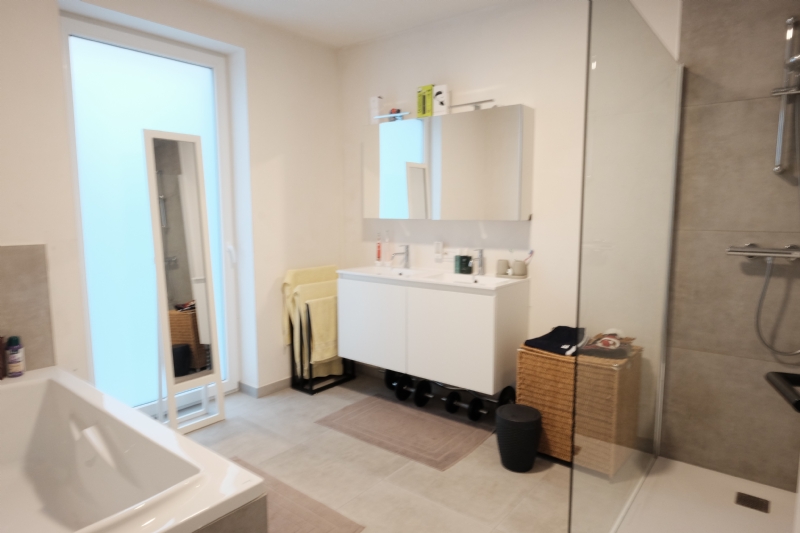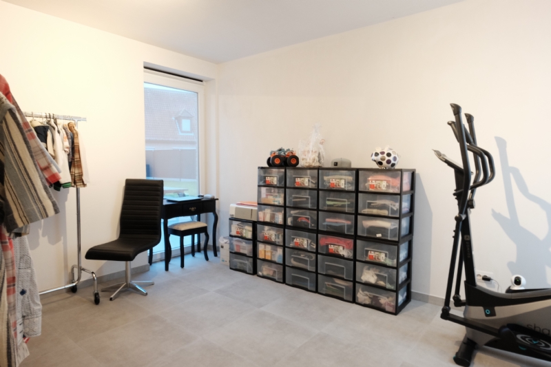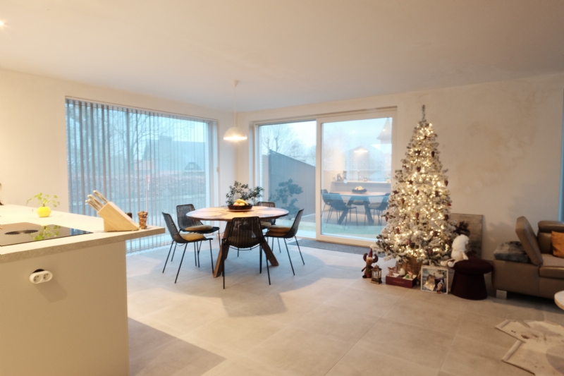 Er is een ruime inkom (met trap),  geeft ook toegang tot een ruime CV-berging met afvoer en toevoer voor wasmachine, en alle technische installatie’s met name de CV ketel, de regenwaterpomp, omvormer voor de zonnepanelen, installatie vloerverwarming, meters en zekeringenkast.  Een andere deur binnen deze berging geeft toegang tot de oprit vooraan. In de inkom is er een toiletruimte met lavabo. Een glazen deur geeft toegang tot de grote zéér lichtrijke livingruimte met volledig open ingerichte keuken, voorzien van alle toestellen zoals vaatwasser, microgolf, oven, inductiekookplaat met inbouwdampkap, koelkast. Alle ramen zijn voorzien van een folie waardoor de inkijk niet mogelijk is.  Er zijn ook lamelgordijnen, inbouwspots en lichtarmaturen. Op het gelijkvloers is er een slaapkamer aan de achterkant, en een ruime badkamer met zowel een ligbad als een ruime douche en dubbel lavabomeubel. Rondom is er een aangelegde tuin , die volledig omheind is en met tuinhekje. Er is een ruime terras en tuinhuis.  De privé oprit is geschikt voor 2 wagens.