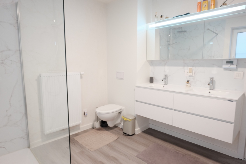 De bovenverdieping biedt toegang naar 2 slaapkamers en een extra ruime berging , een tweede badkamer is voorzien van een grote douche, een dubbel lavabomeubel en extra vaste hangkasten. Overal zijn er horren in de ramen.