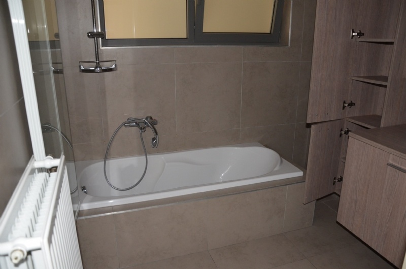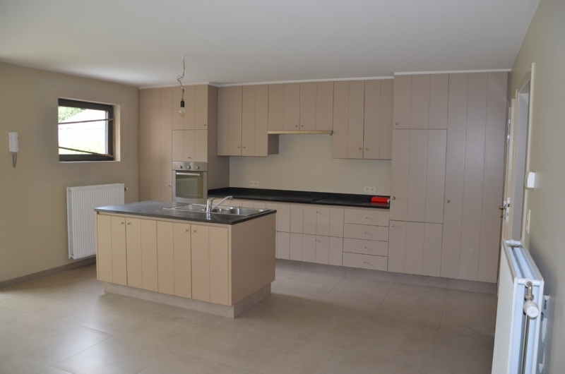Inkomhal, toilet , living met open ingerichte ruime keuken (kookplaat, dampkap, frigo, oven, afwasbekken), keukenberging, terras met tuin, twee slaapkamers, ingerichte badkamer (ligbad-douche, dubbel lavabomeubel, wasplaats)